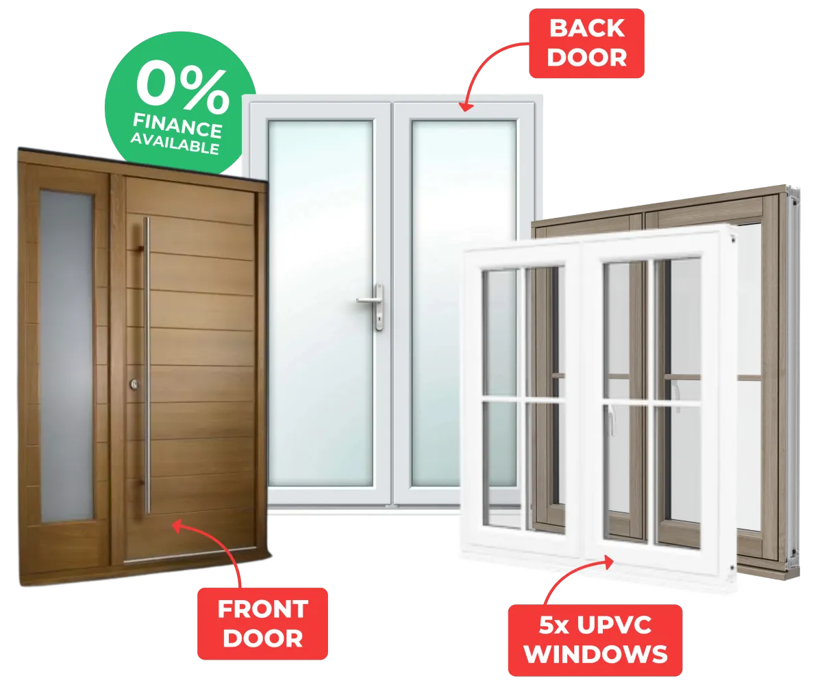 This exclusive offer gives you everything you need to transform your home: a brand-new front door, a secure back door, and 5 A-rated UPVC windows. All expertly fitted by our accredited installers, with free installation this month only.