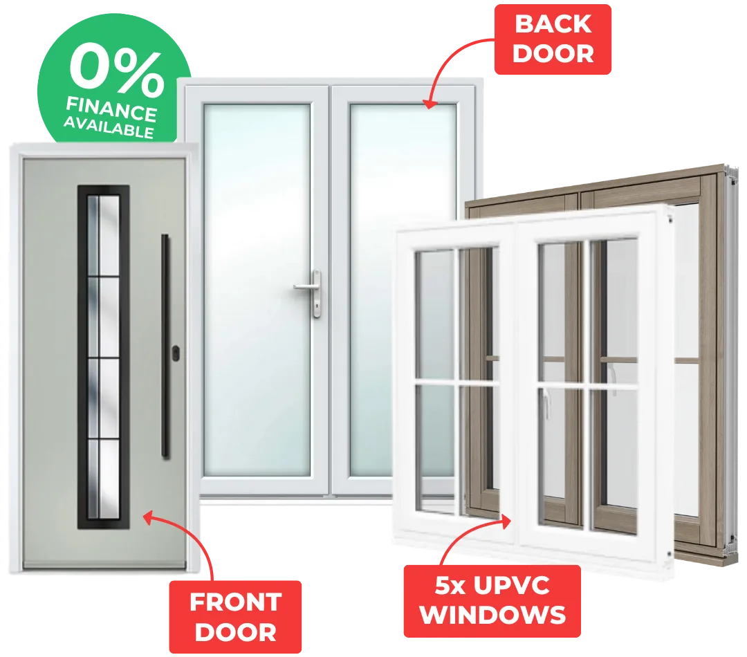 This exclusive offer gives you everything you need to transform your home: a brand-new front door, a secure back door, and 5 A-rated UPVC windows. All expertly fitted by our accredited installers, with free installation this month only.